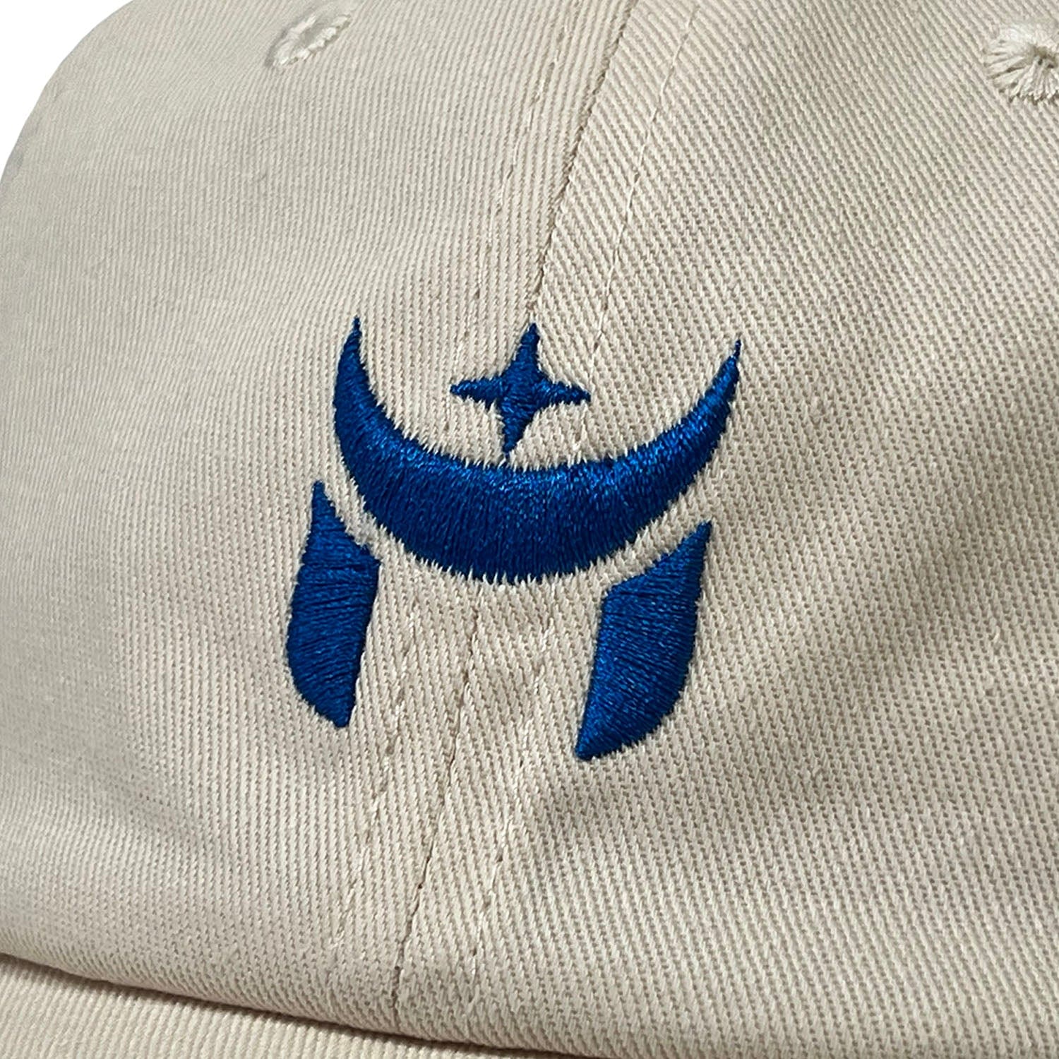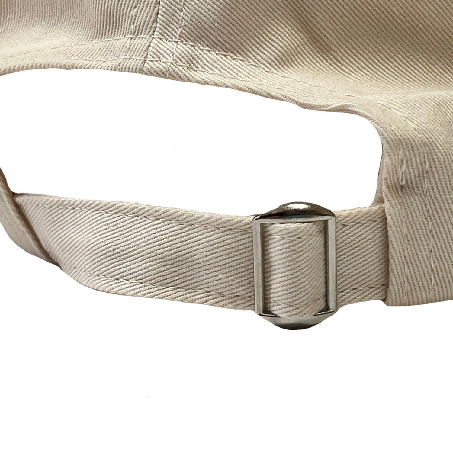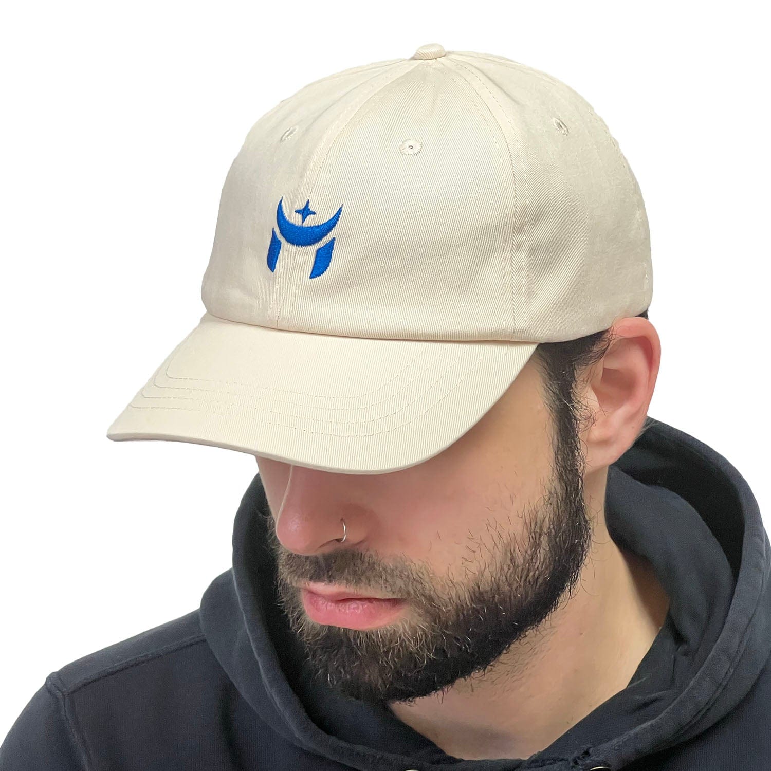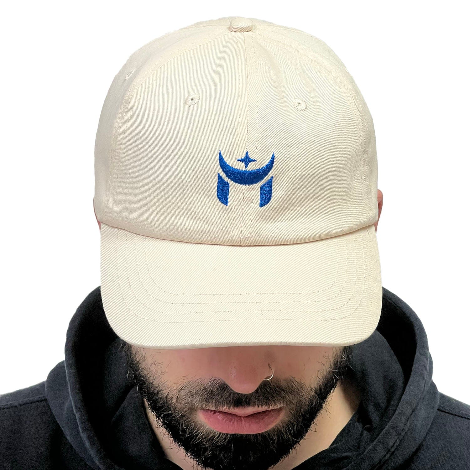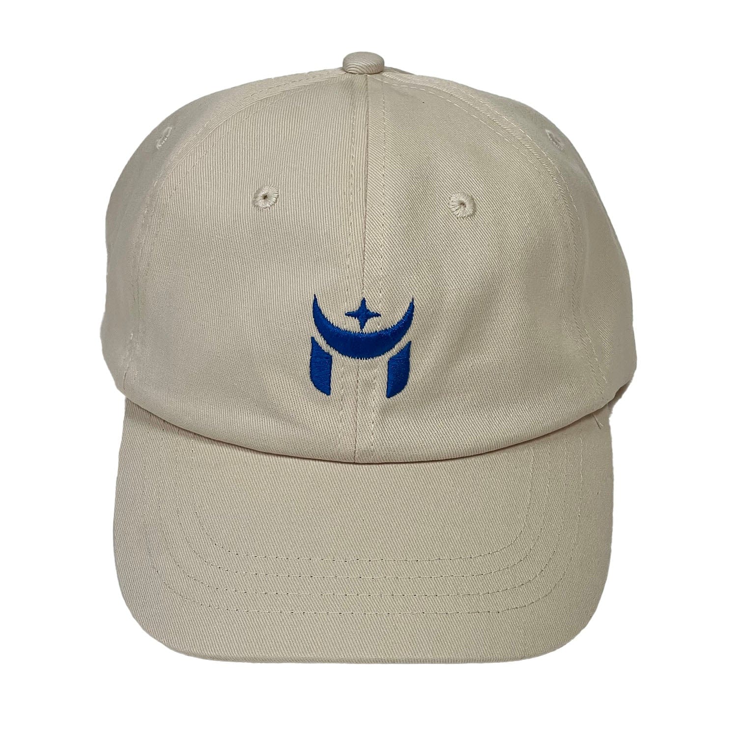This beige Dat Hat embroidered in beautiful blue with the signature M is one size fits all.