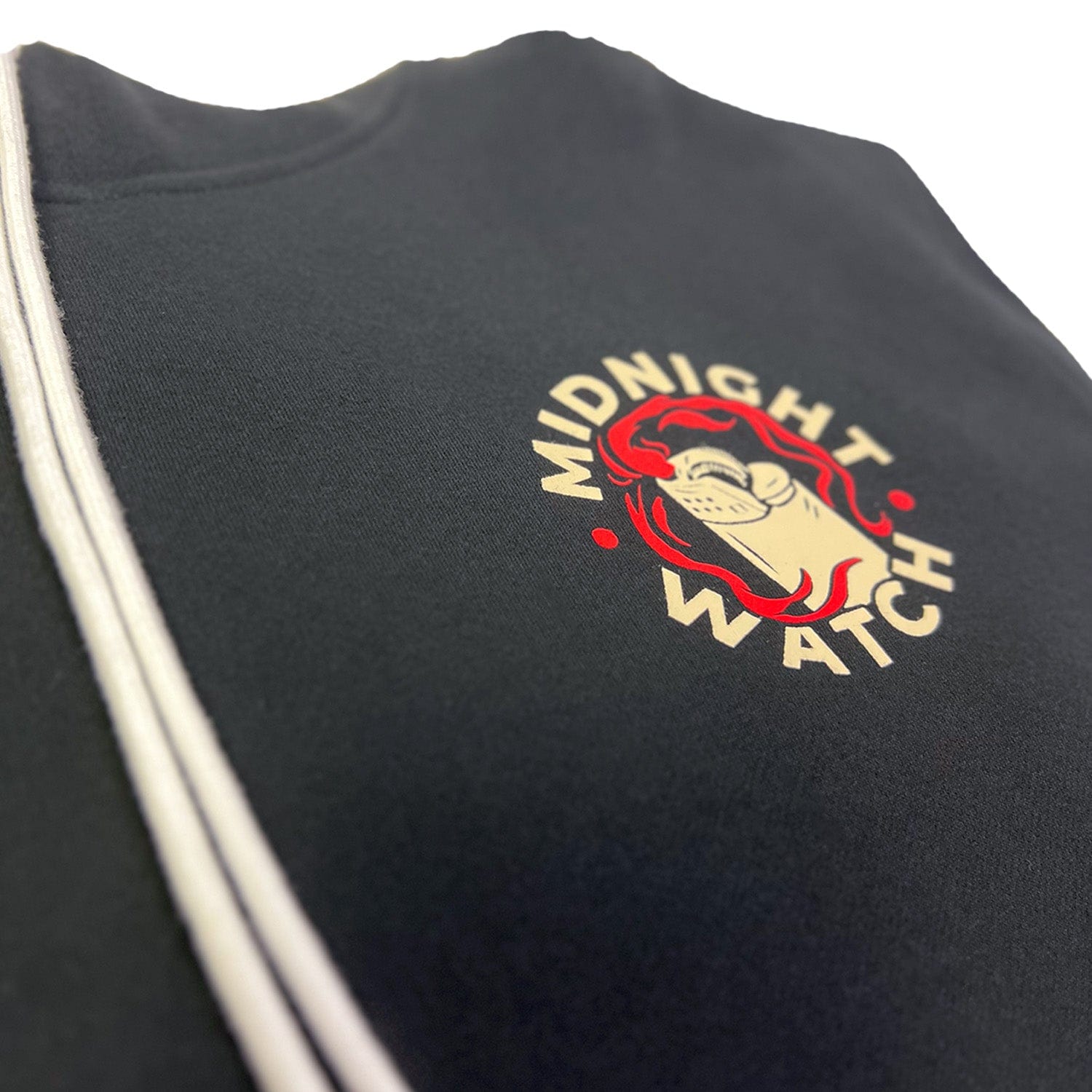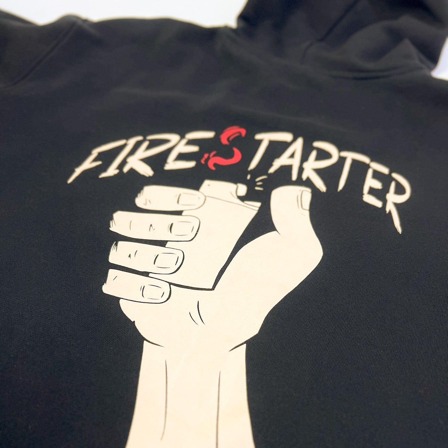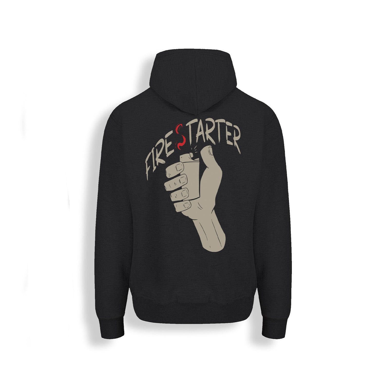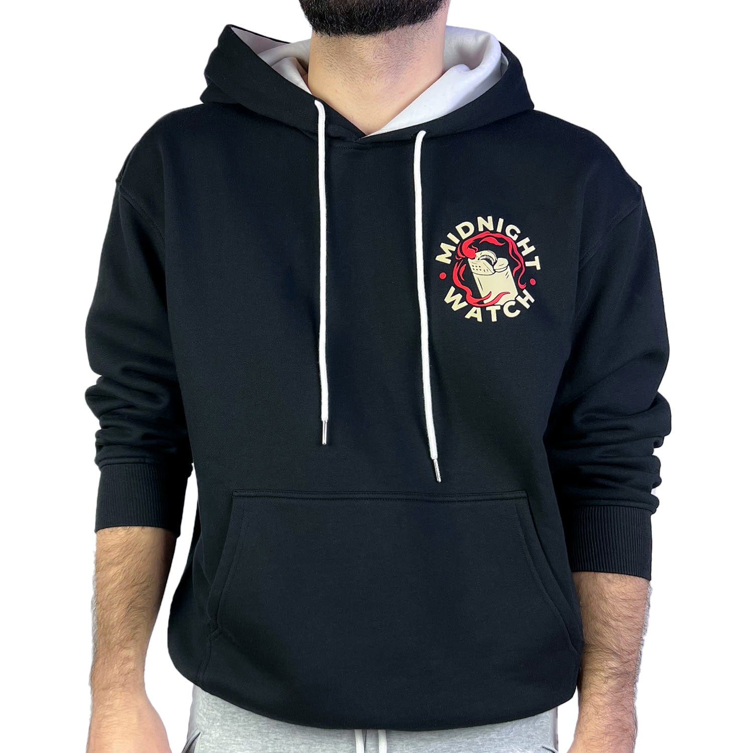 This comfy medium weight hoodie has white strings, white inside hood, a front patch design, and a back print.