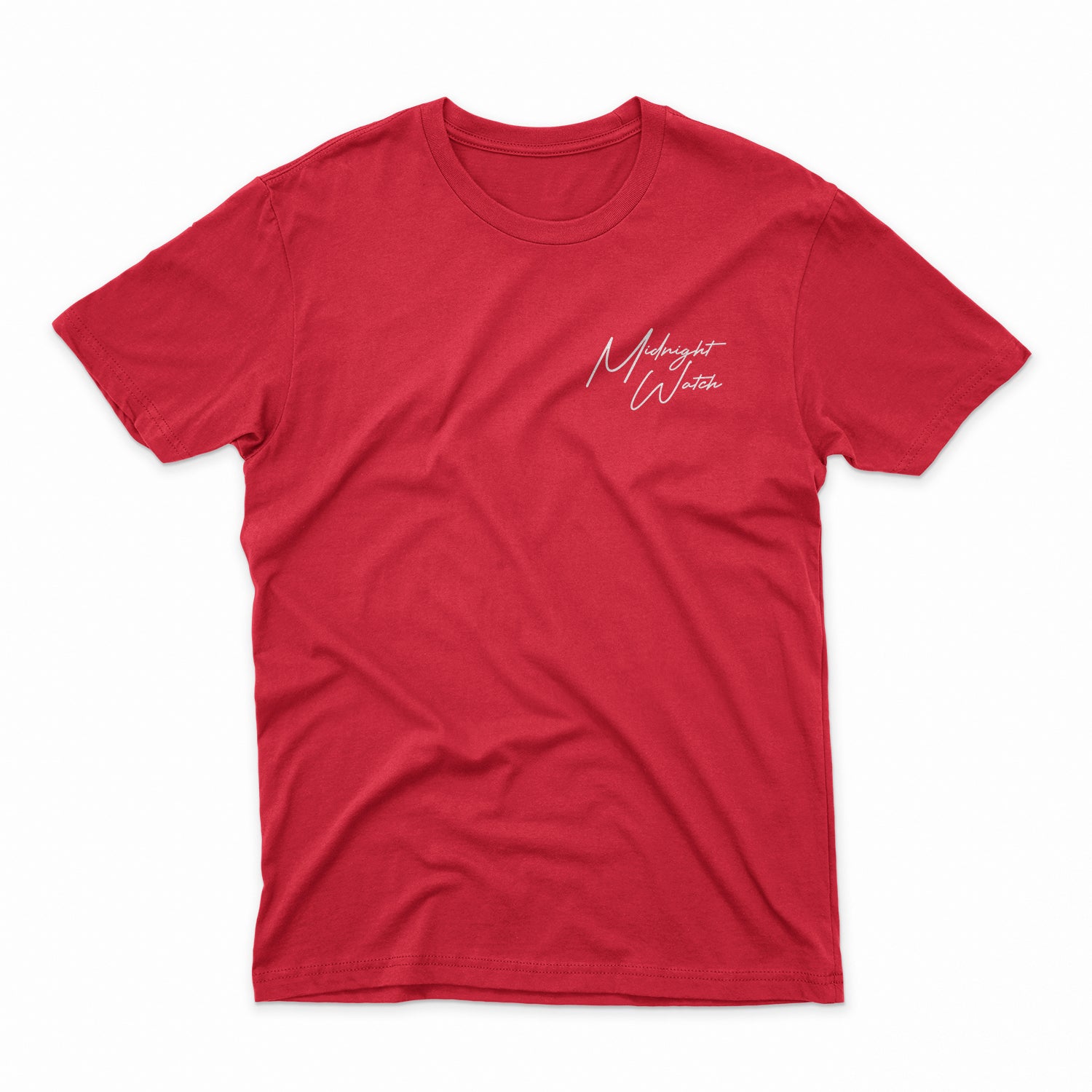 is simple crimson tee has the exclusive Midnight Watch script printed on the left chest.