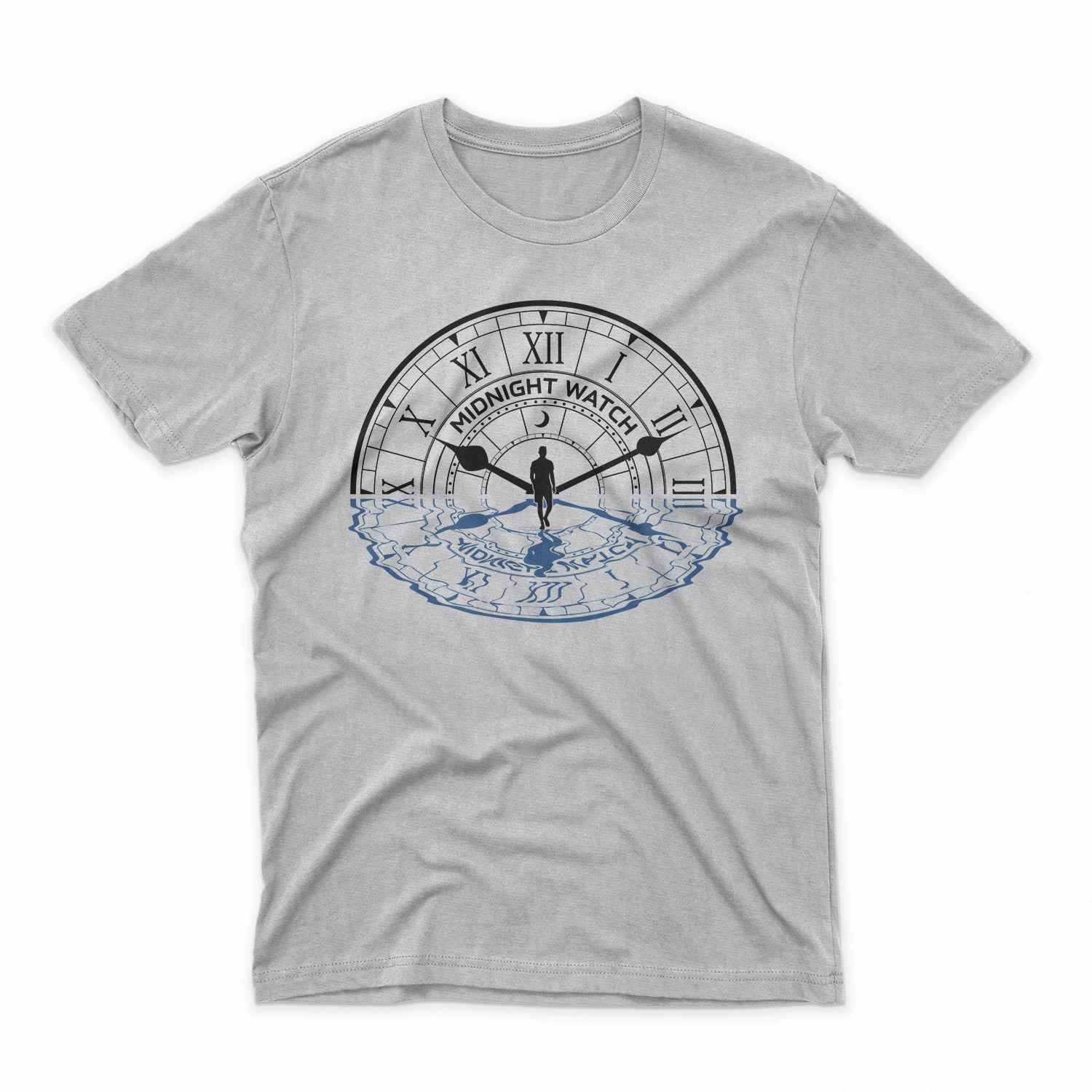 This Water Clock Tee by The Midnight Watch depicts the face of a clock tower half sunken underwater as a man wades away.